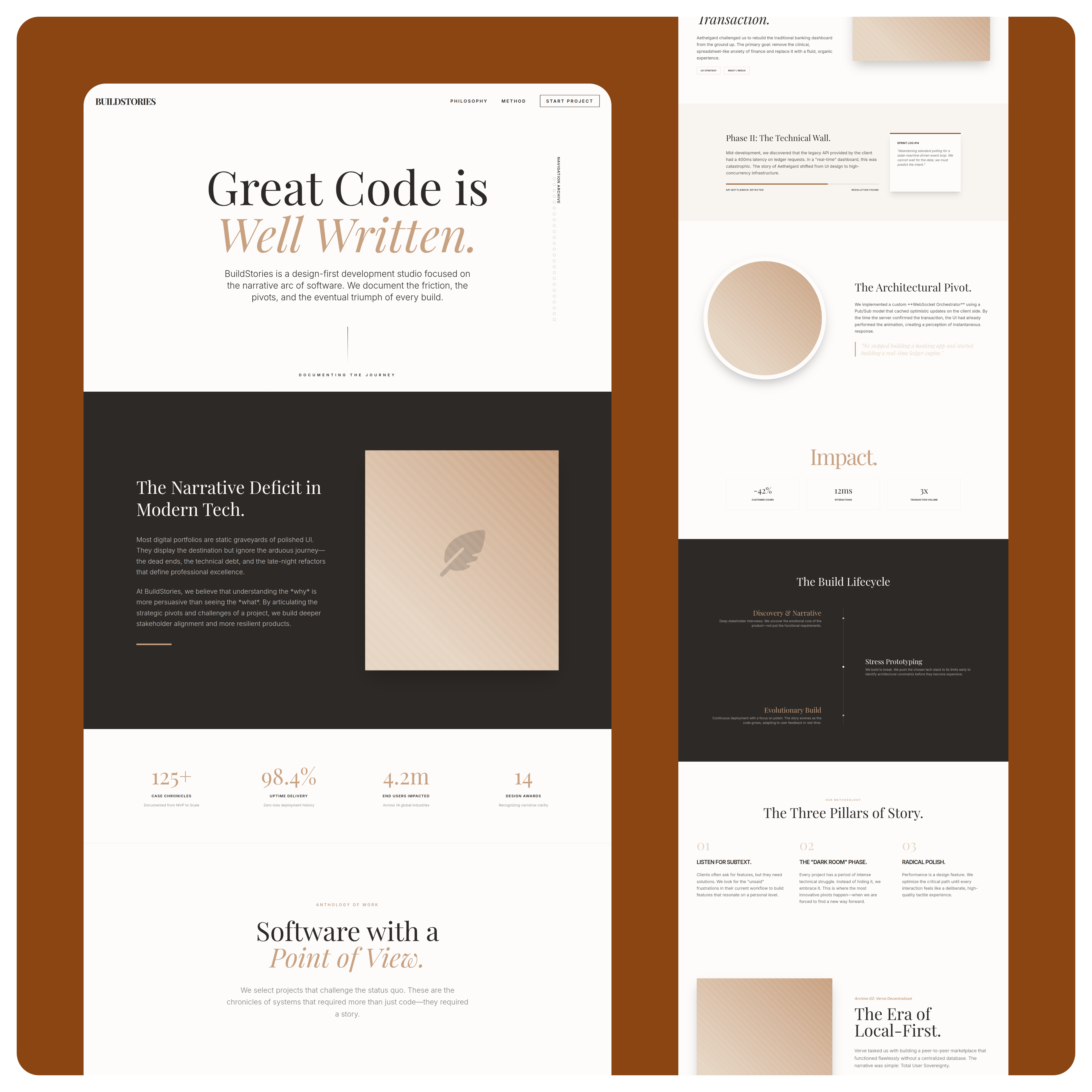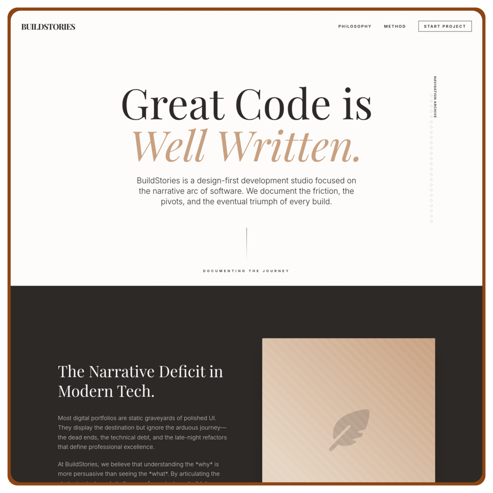 - A narrative-driven homepage that walks visitors through how you build, not just what you build