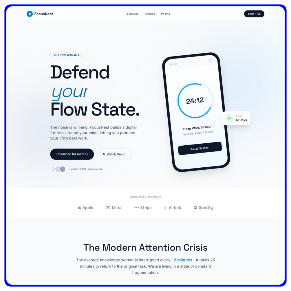 FocusNest — Minimal Productivity App Website for Deep Work & Focus Tools (Tailwind + Modern UI)
