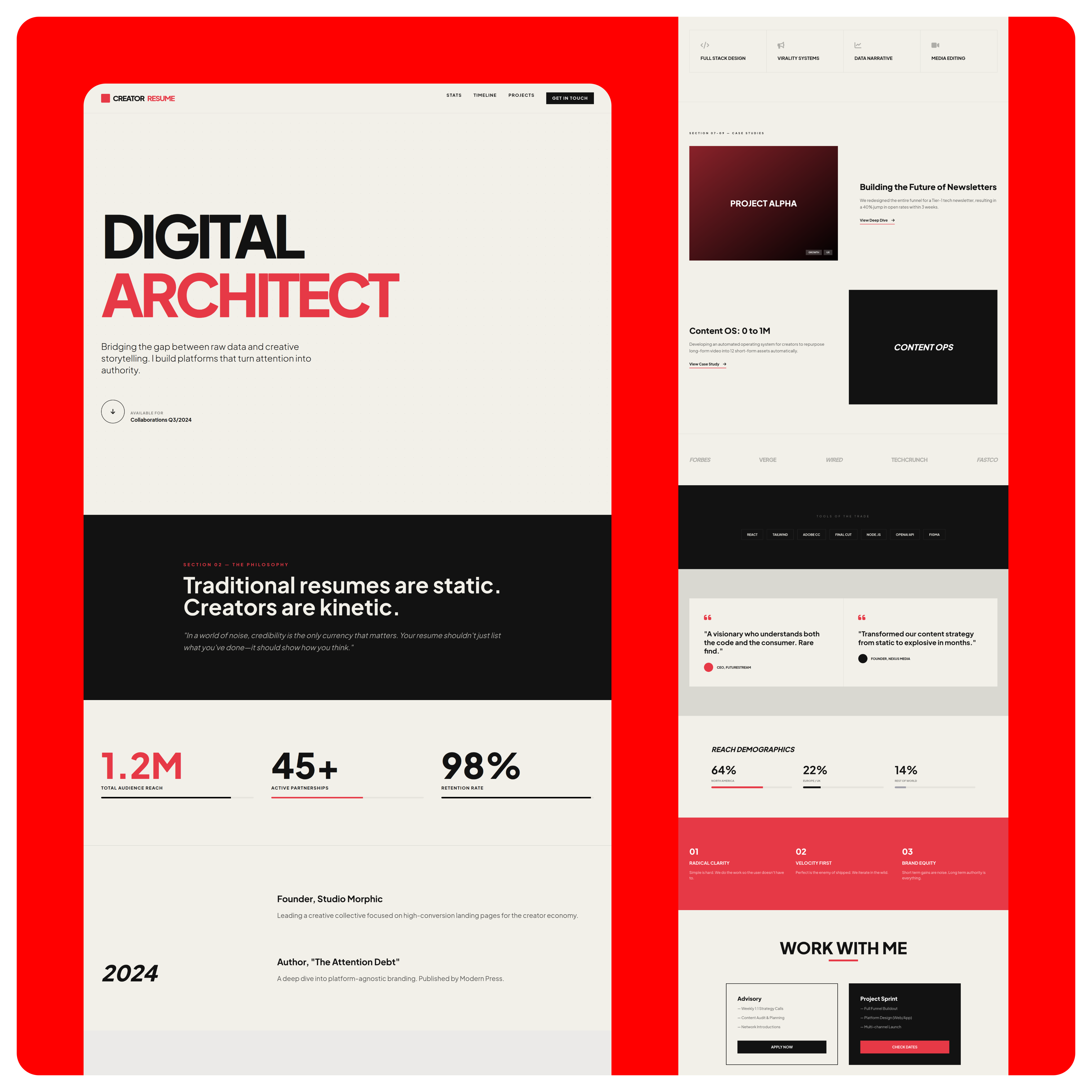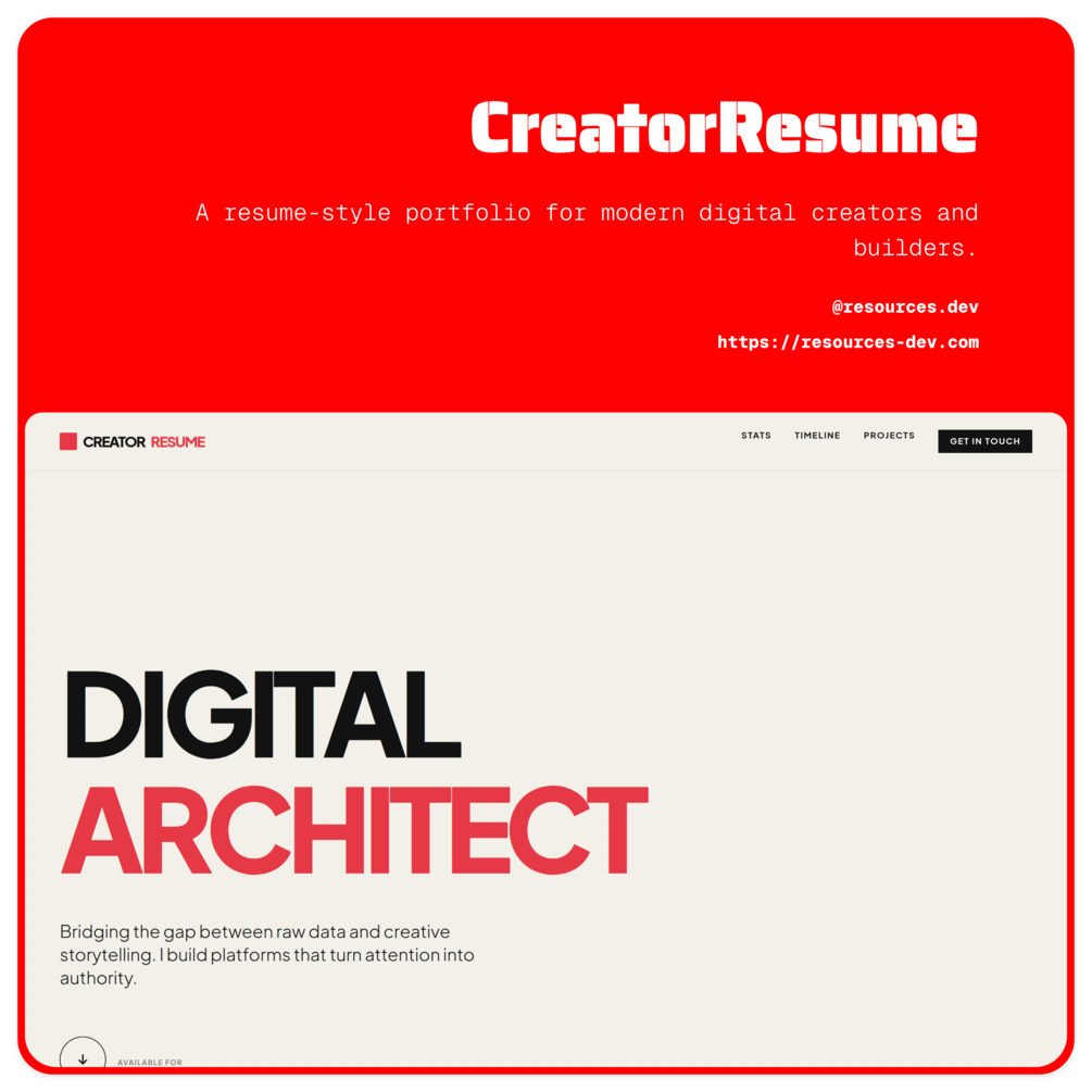 CreatorResume is a modern, high-impact personal website template built specifically for creators, designers, developers, writers, indie hackers, and internet professionals who want their work to speak louder than a PDF resume ever could.