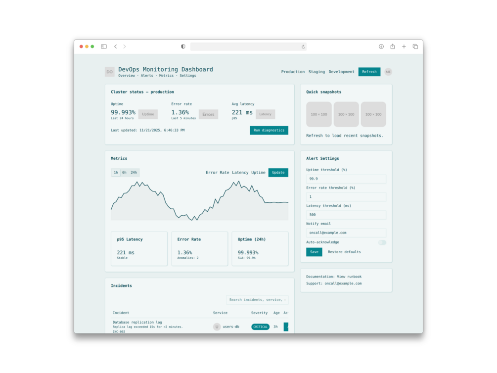 A clean, modern, production-ready DevOps Monitoring Dashboard UI built using React, TypeScript, and Tailwind CSS — perfect for SaaS products, internal tools, monitoring platforms, or developer dashboards.