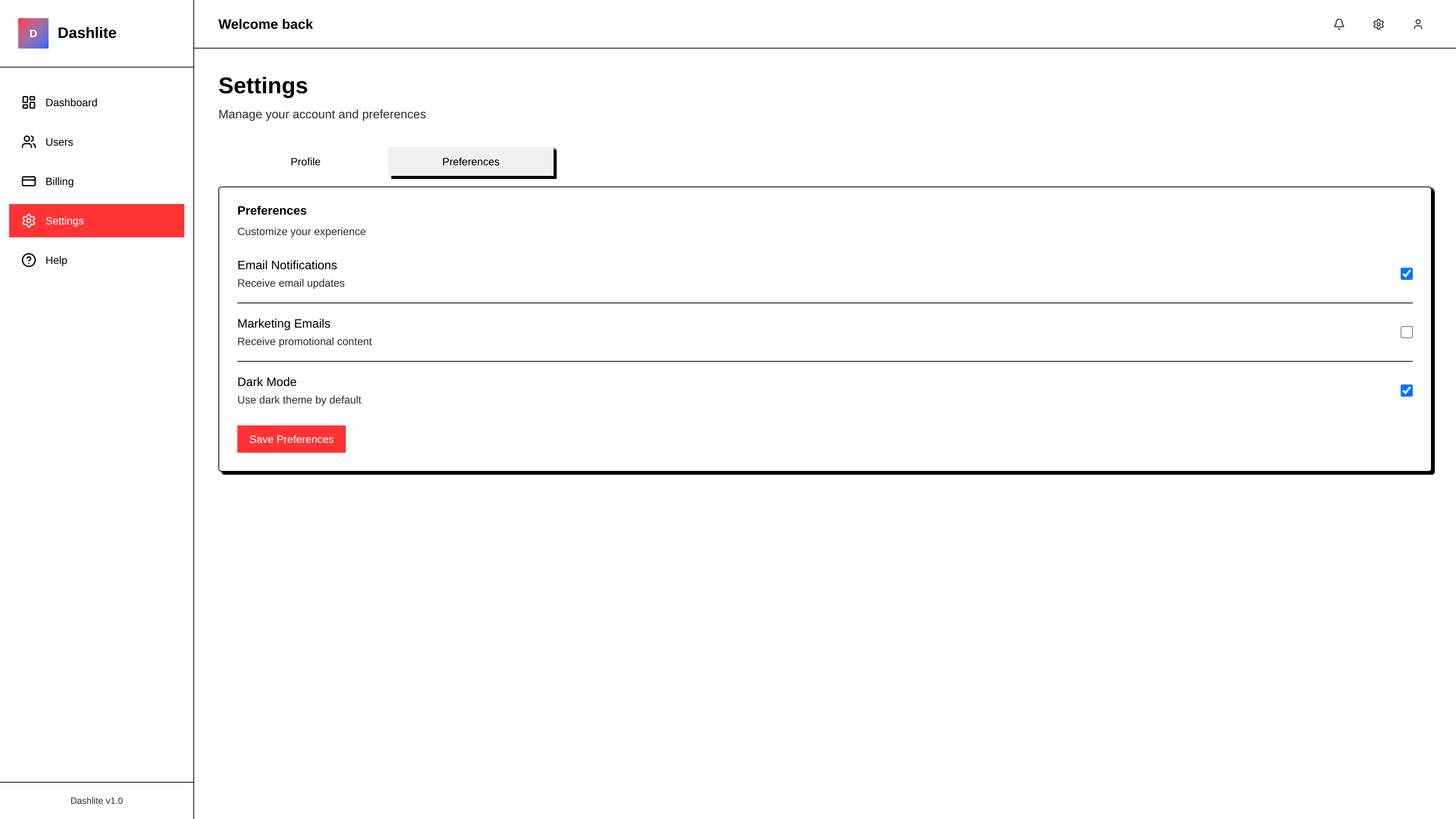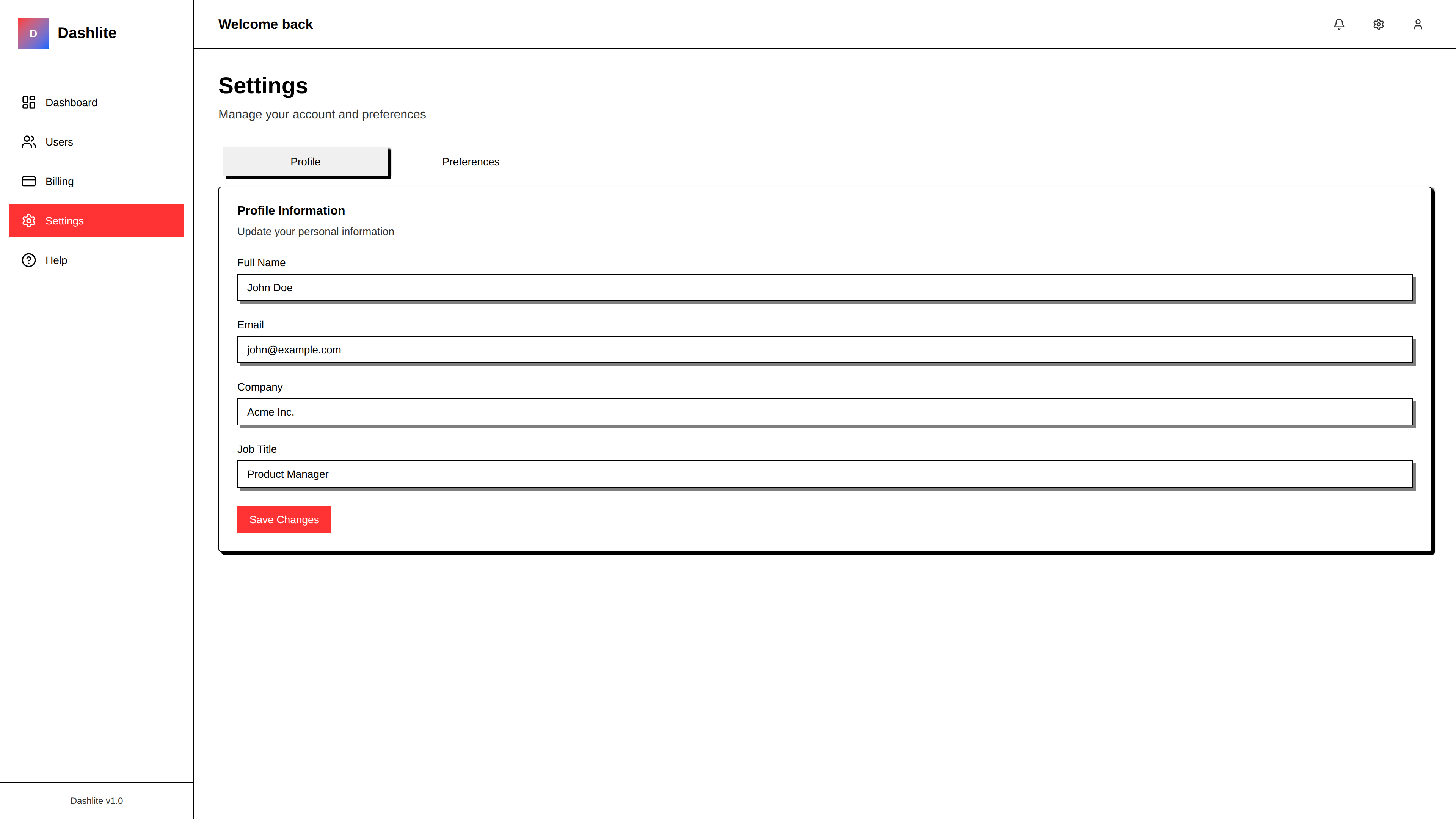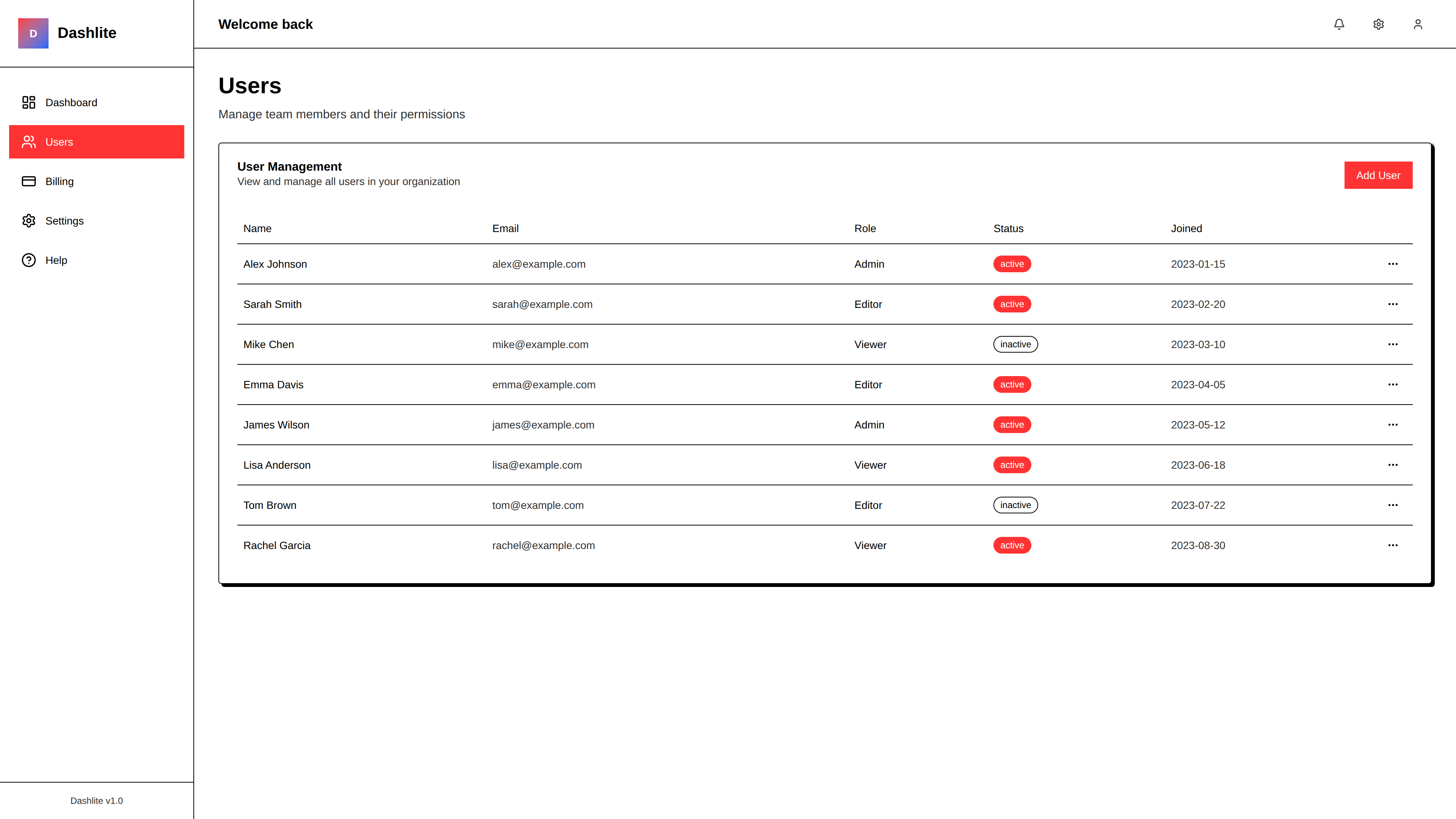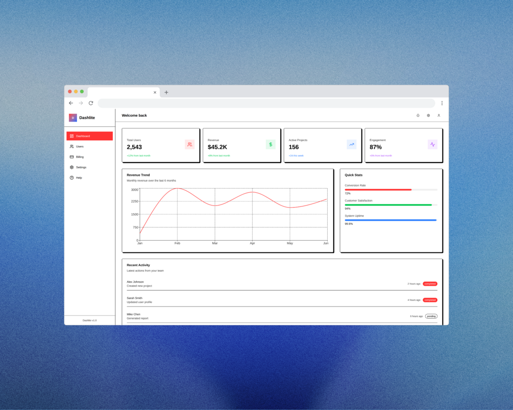 - Pages: Dashboard, Users, Settings, Billing, Help
