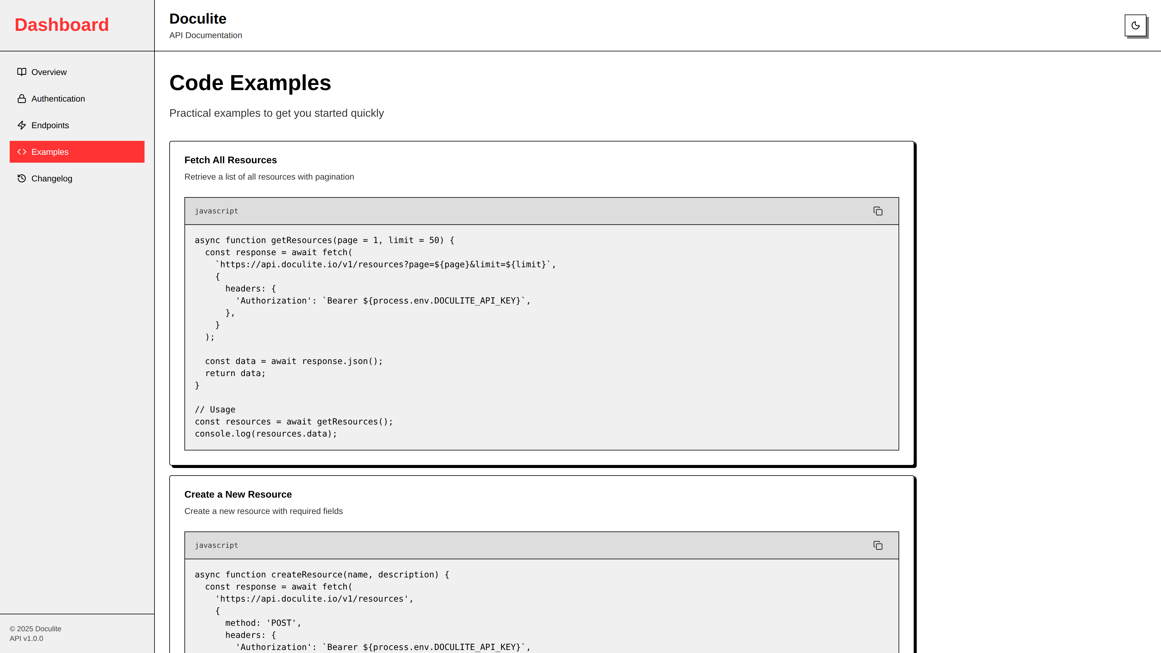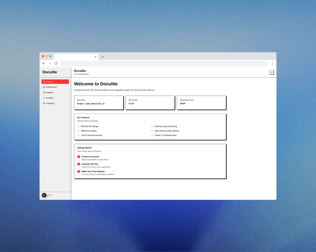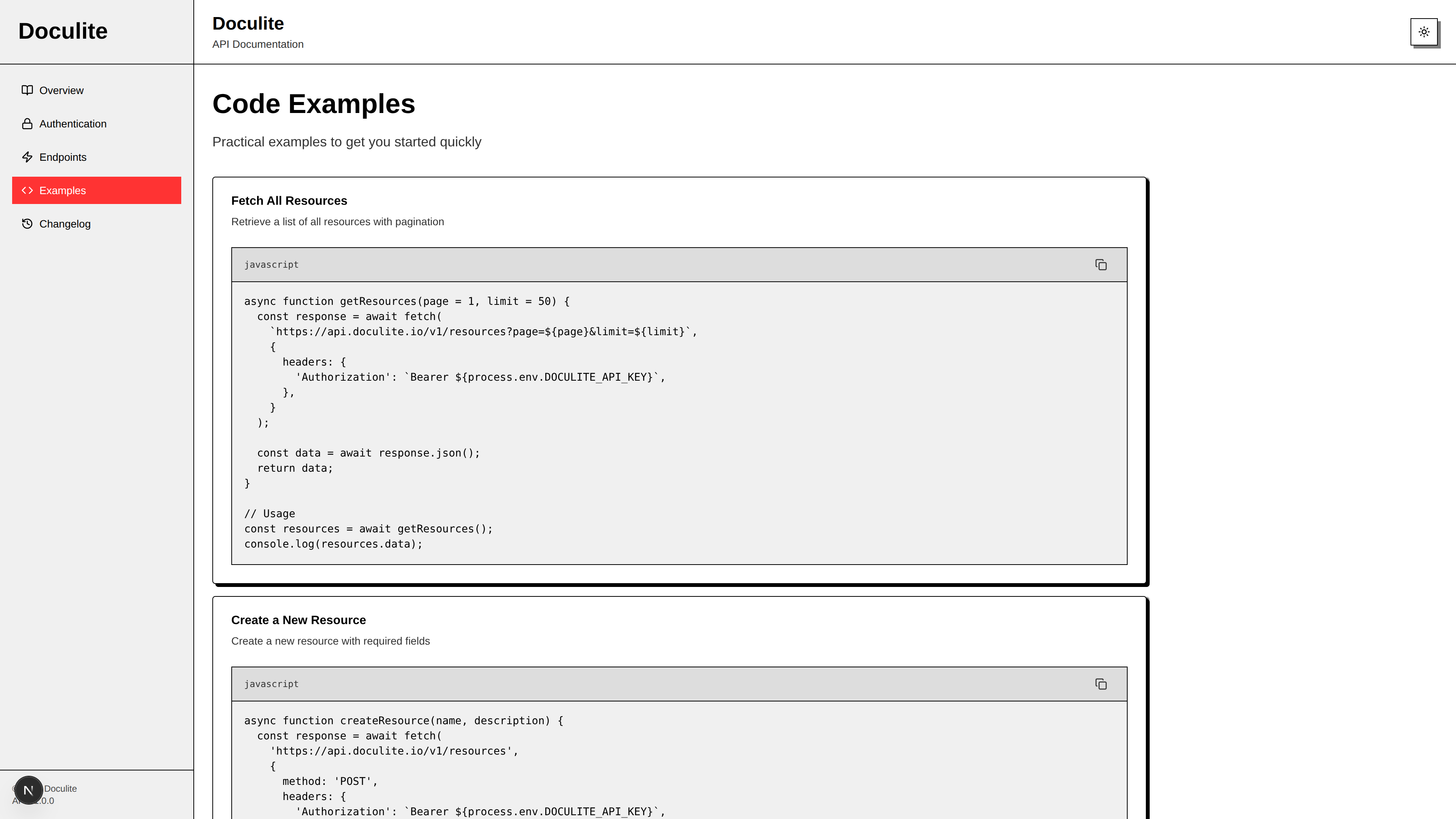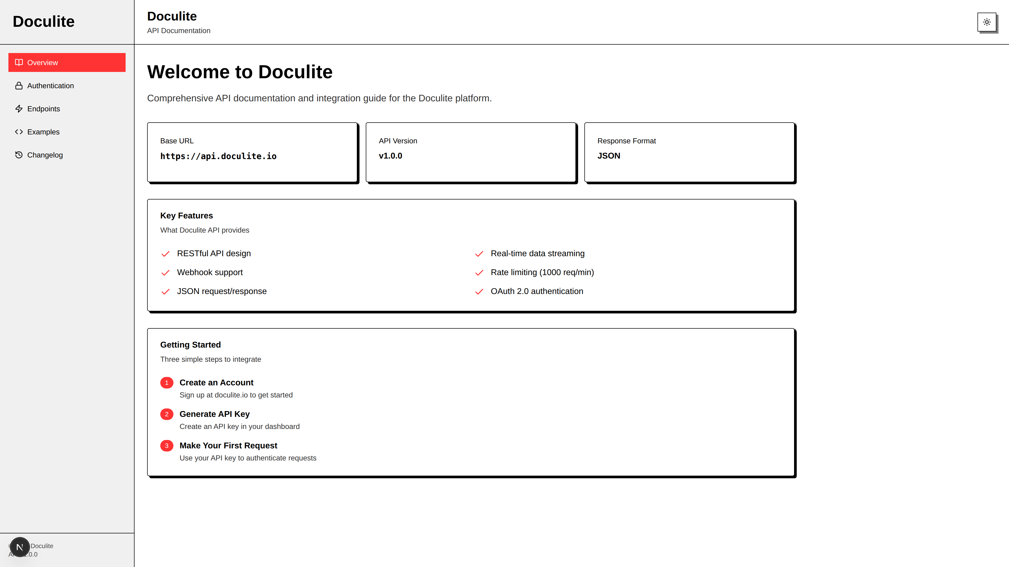 Built with Next.js, Tailwind, and shadcn/ui, it features clean typography, code blocks, and a sidebar layout that’s perfect for SDK or API docs.