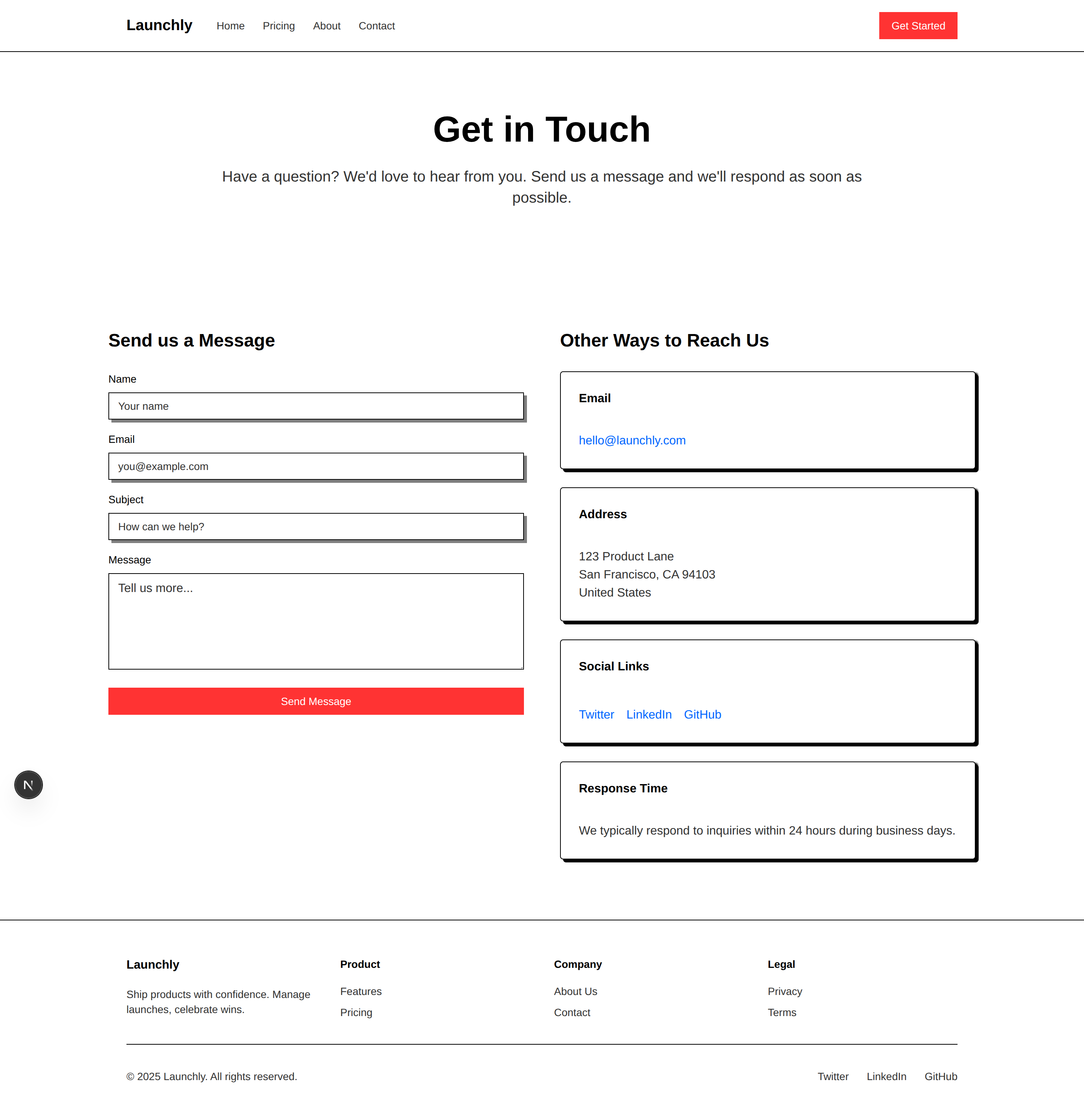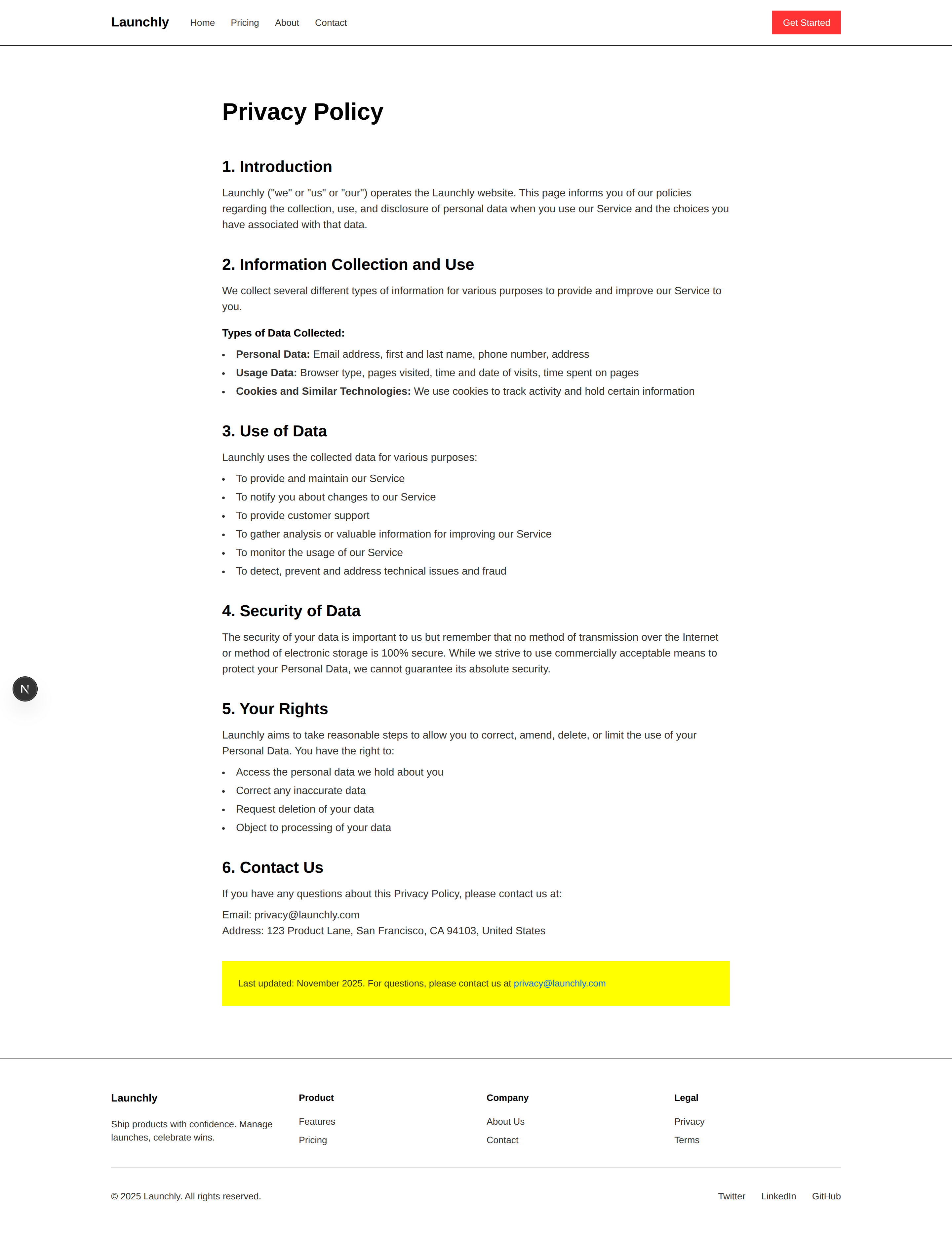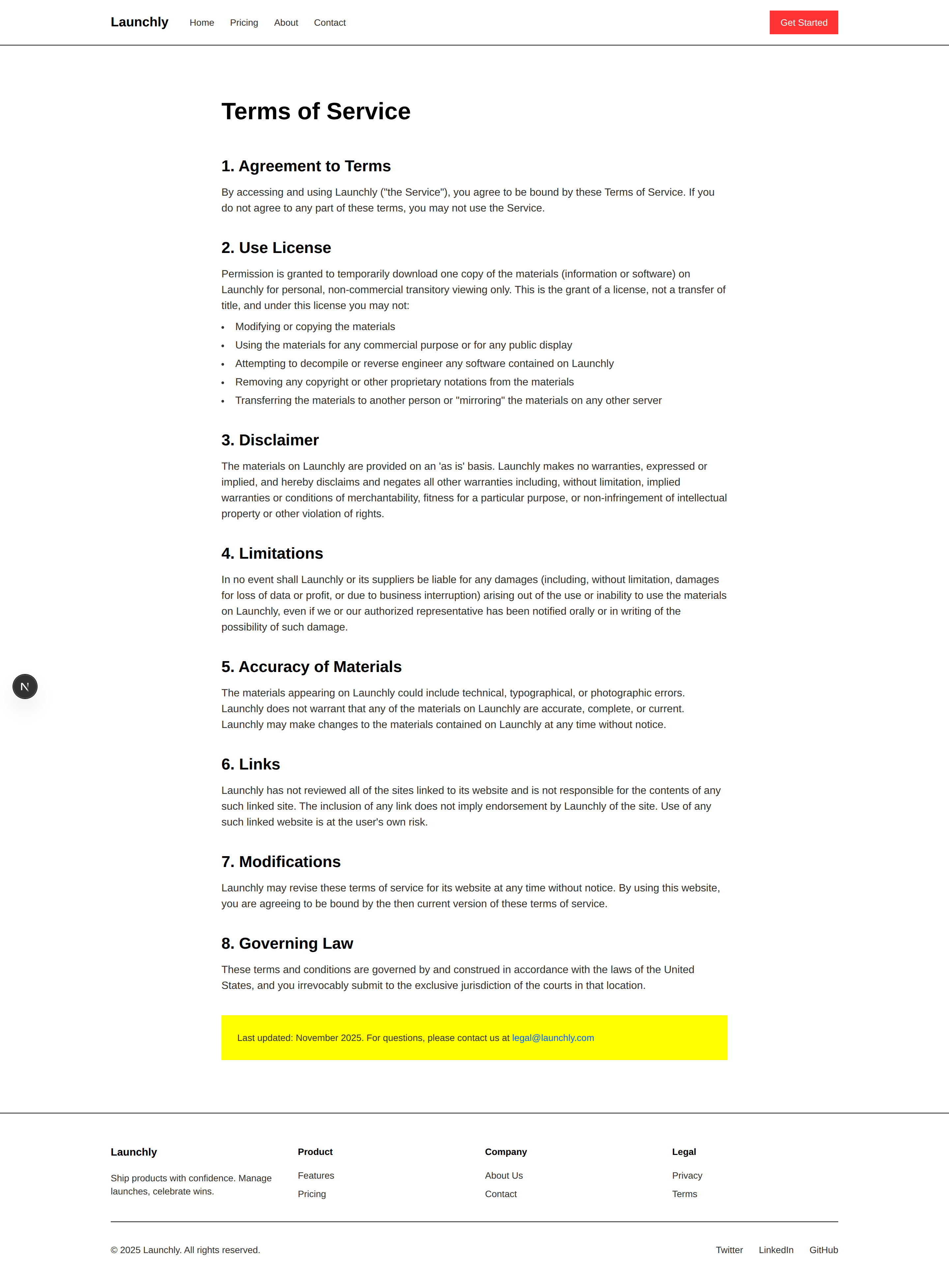 Includes all essential marketing pages: Home, Pricing, About, Contact, Terms, and Privacy.