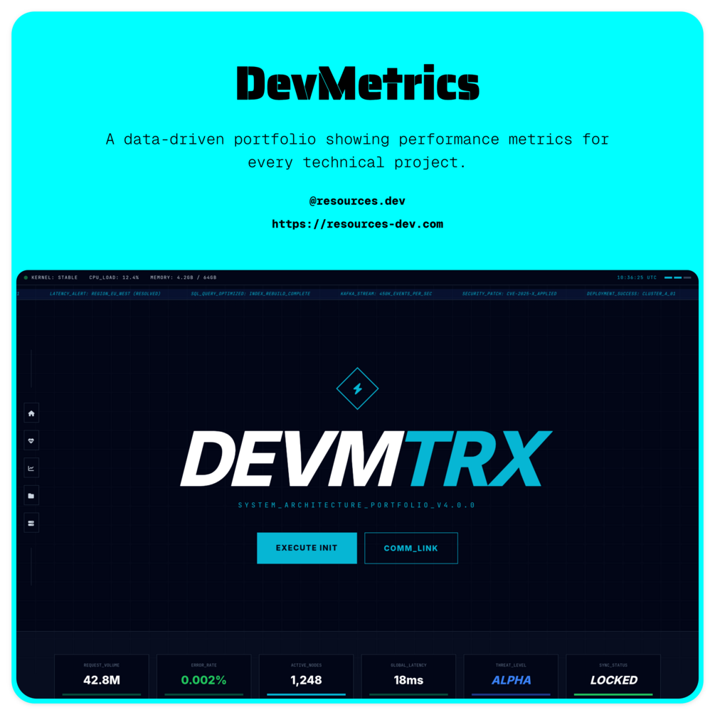 DevMetrics is a developer-first portfolio website template designed to help engineers, indie hackers, and technical founders show real impact instead of just listing skills.