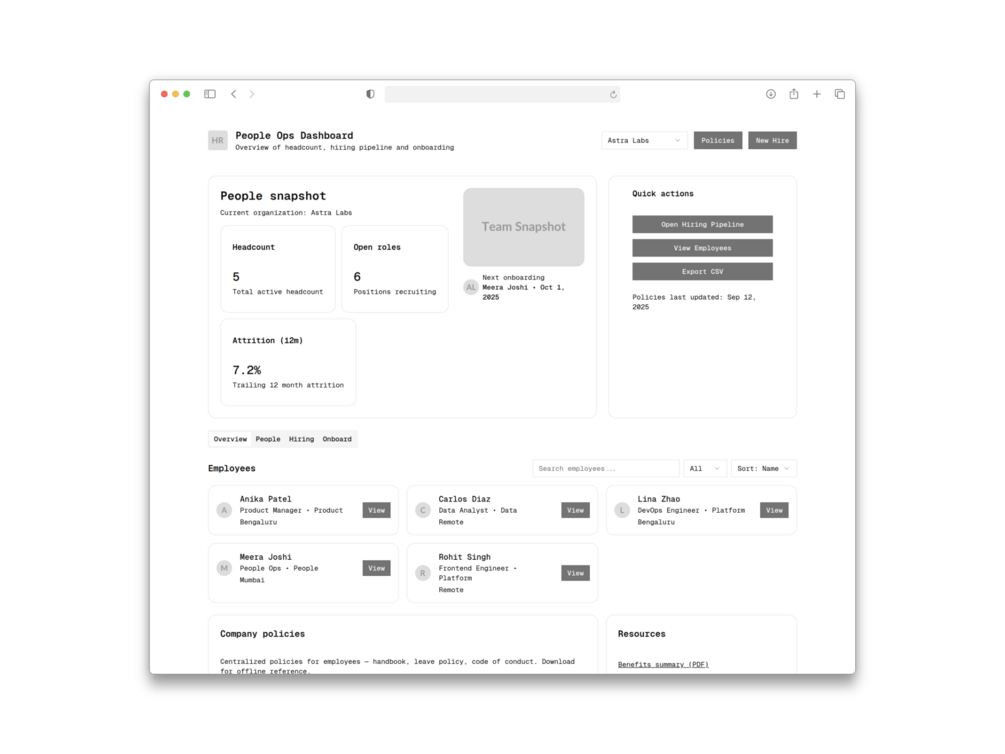 - Headcount, open roles, attrition, and snapshot KPIs